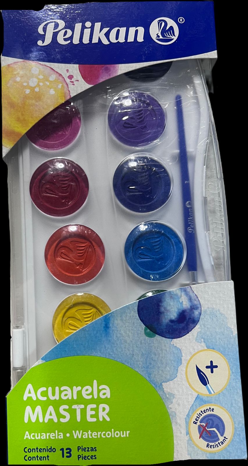 Set de pintura de acuarela solida, marca pelikan con 12 piezas y un pincel.